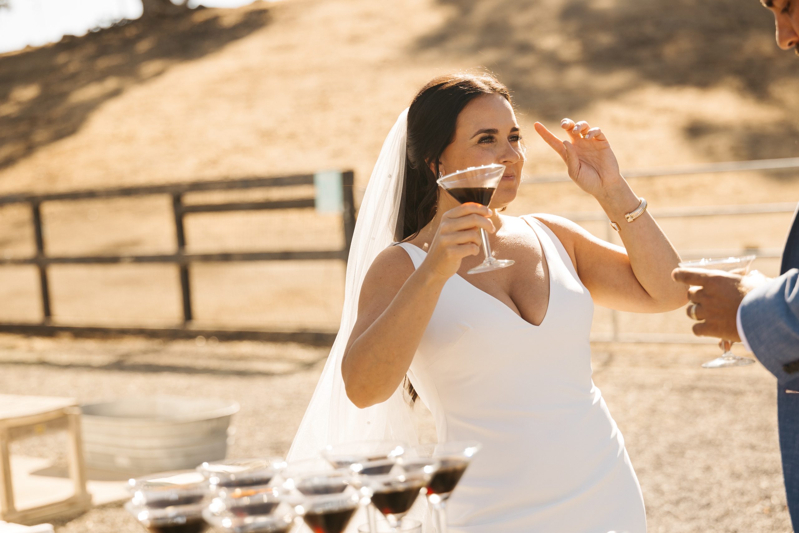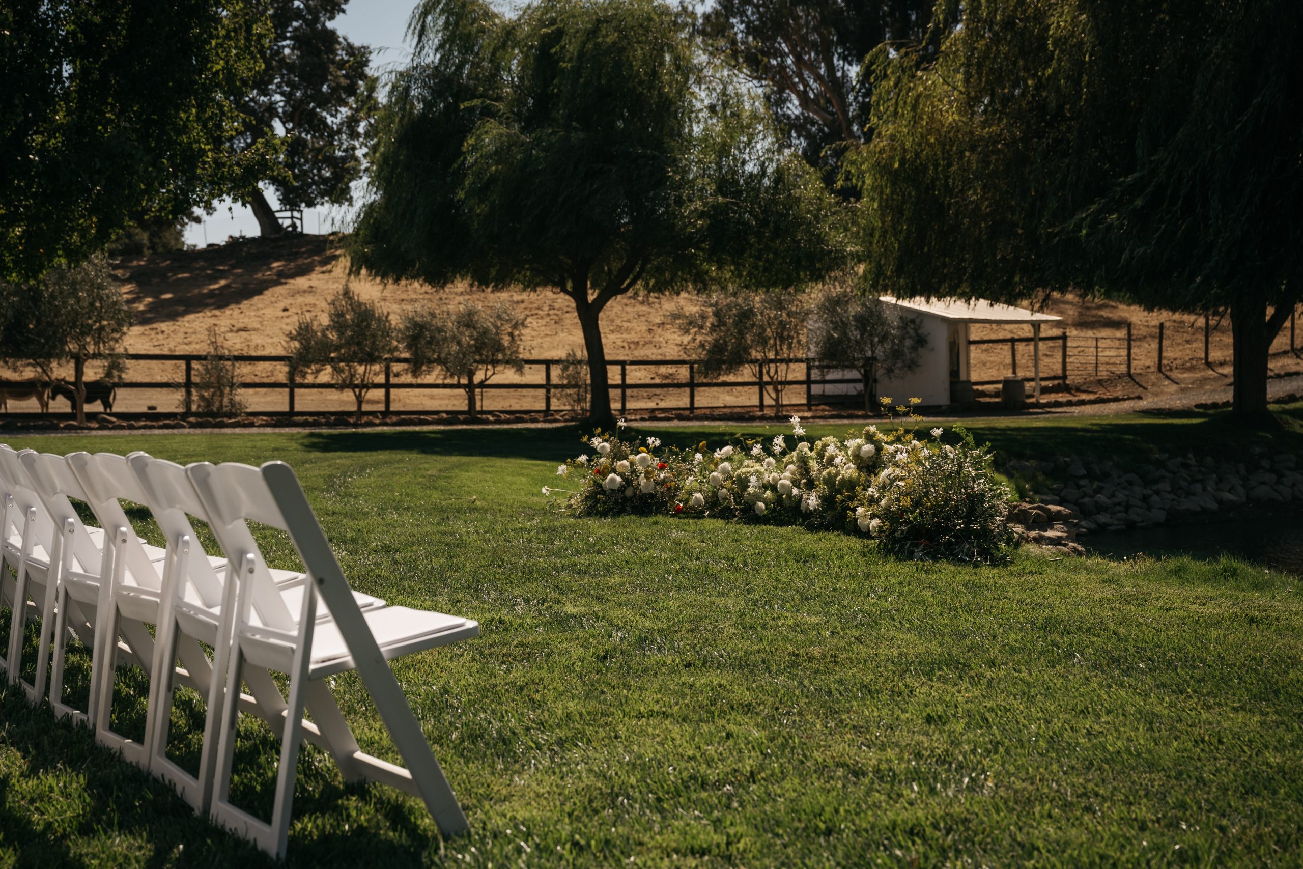 The day unfolded seamlessly across the property, beginning with a lakeside ceremony that felt vibrant, joyful, and deeply personal. Guests then transitioned into cocktail hour, where an espresso martini tower kicked off the celebration alongside personalized games, a charming ice cream cart, and a seating chart installation that doubled as art. Dinner followed inside the transformed horse arena — family-style, draped, candlelit, and intentionally intimate despite the 250-person guest count. As the evening continued, guests were surprised by a live band that launched the dance reception into full energy mode, complete with lemon drop shots from a custom ice sculpture, florals everywhere you looked, and a courtyard party that spilled into the night.