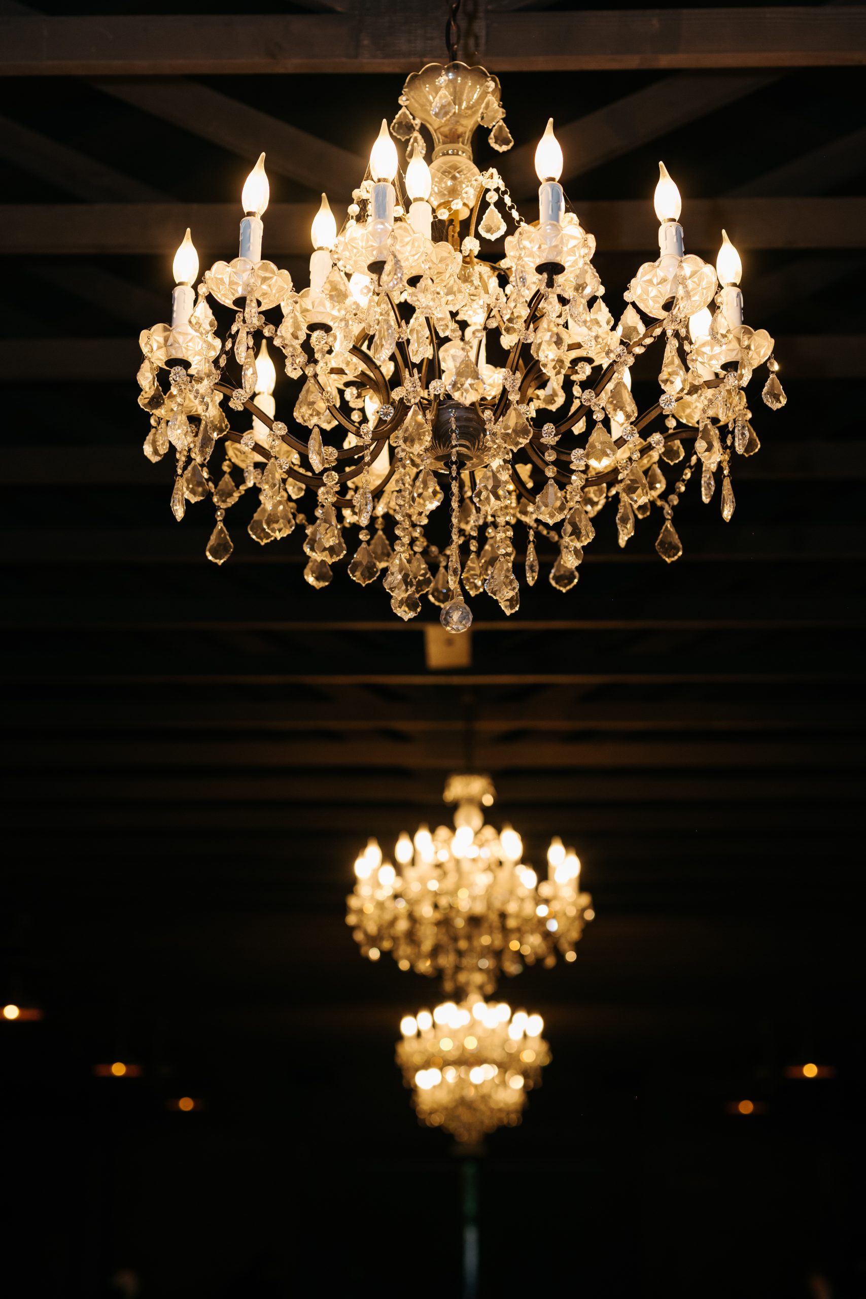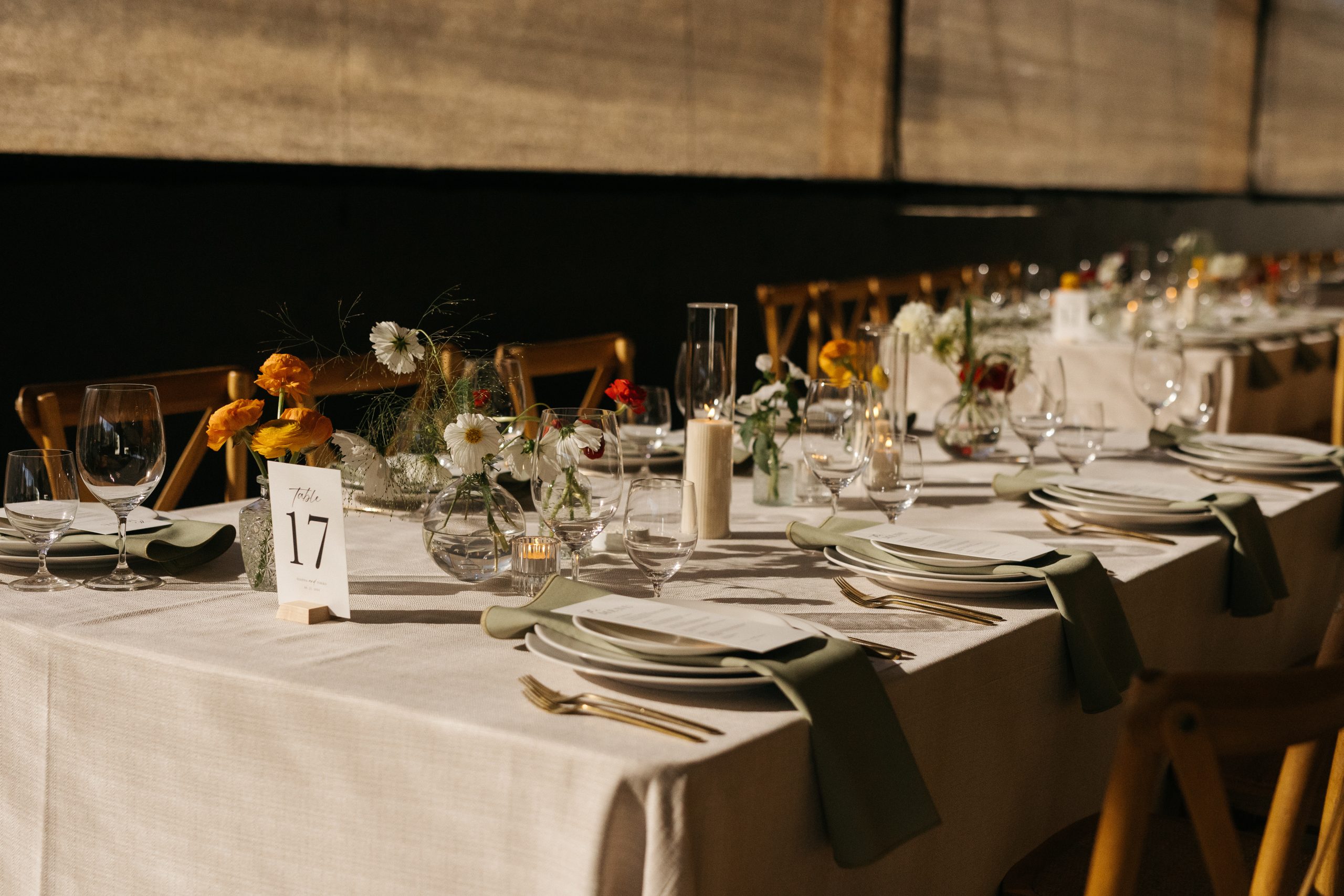 Dinner Reception: Dinner was served family-style in the horse arena, which we transformed completely. Drapery and custom greenery chandeliers were installed overhead to warm the space and make it feel intimate despite the 250-person guest count.