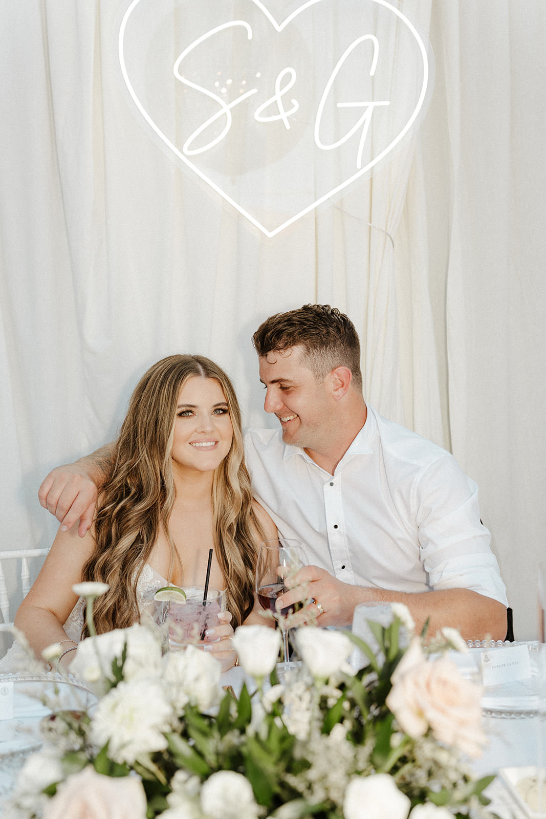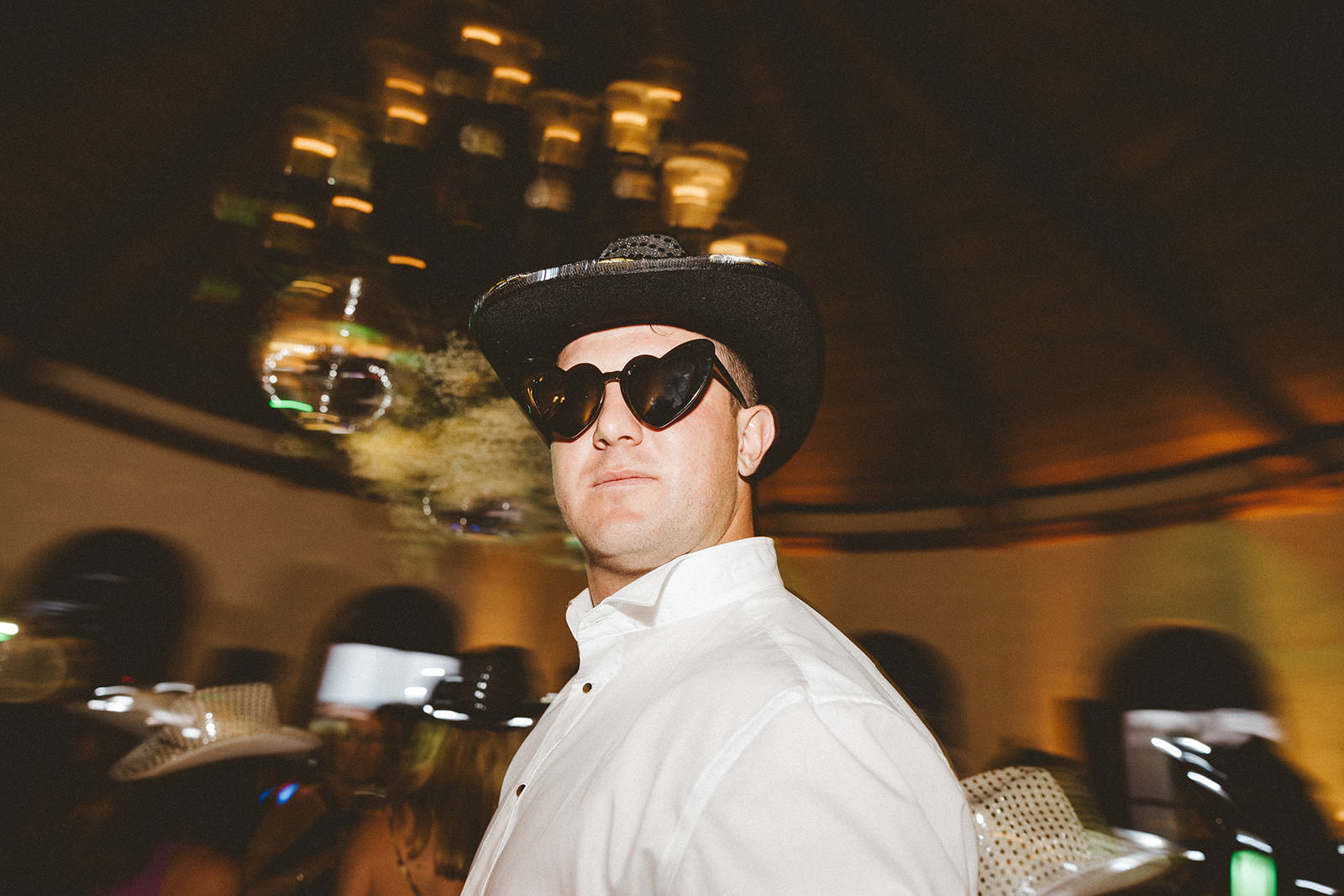 Above the dance floor, a dreamy installation of baby’s breath chandeliers and disco balls reflected light throughout the night, creating a magical, energetic atmosphere. Guests were invited to grab shiny cowboy and cowgirl hats for the dance floor, bringing a playful twist to the elegant setting. Behind the sweetheart table, a custom neon sign with the couple’s initials added a bold, modern statement.